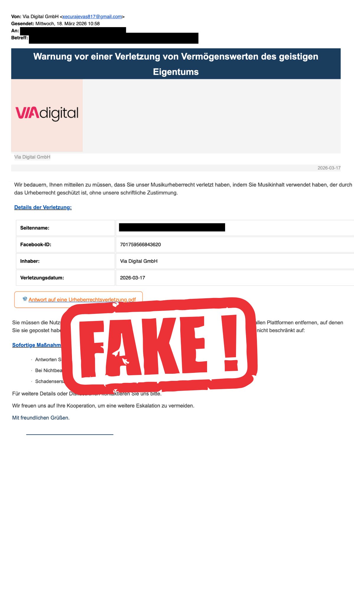 Wir wurden darauf aufmerksam gemacht, dass derzeit betrügerische E-Mails im Namen der Via Digital GmbH versendet werden. Die Absender geben sich fälschlicherweise als unsere rechtlichen Vertreter aus und behaupten, es lägen Urheberrechtsverletzungen vor.